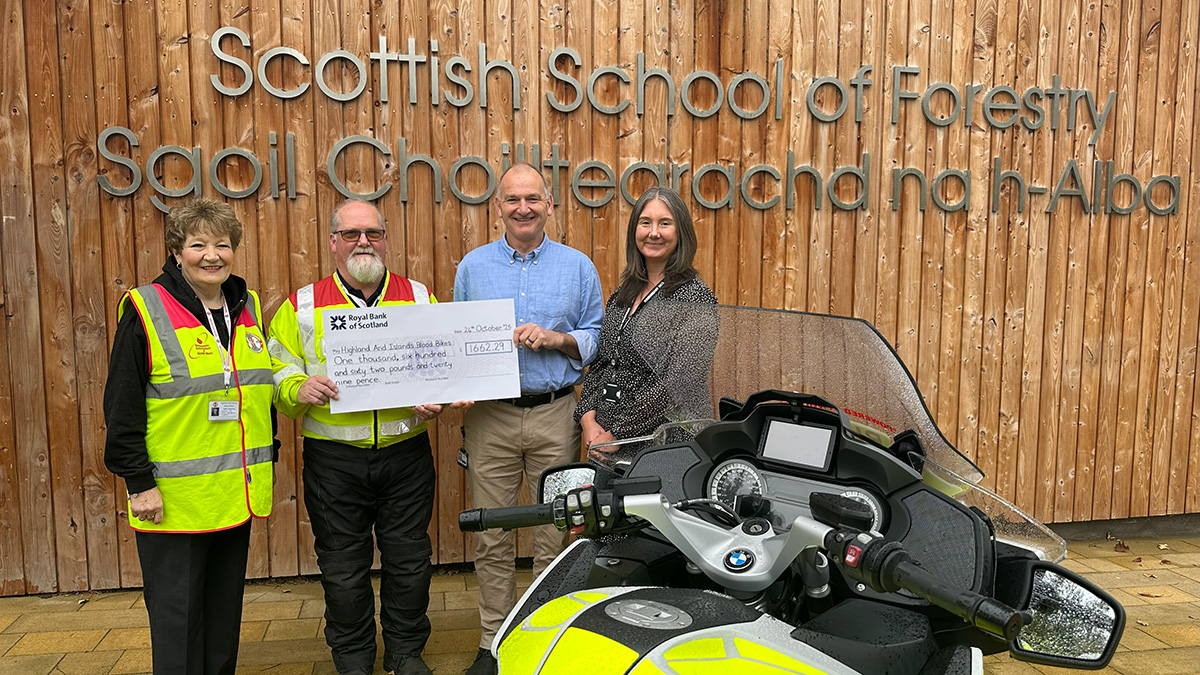 A further £663 was raised through donations, a bake sale and raffle held on campus on the last day of the survey. As a result, a total of £1,662 was presented to the blood bikes charity at a special event at the Scottish School of Forestry campus today (Friday, 24 October). The cheque was received by Neil Stewart, a former forestry lecturer at the Balloch campus, who is the charity’s Events Manager and rider. He was accompanied by Helen Robertson, one of the charity's fundraisers.